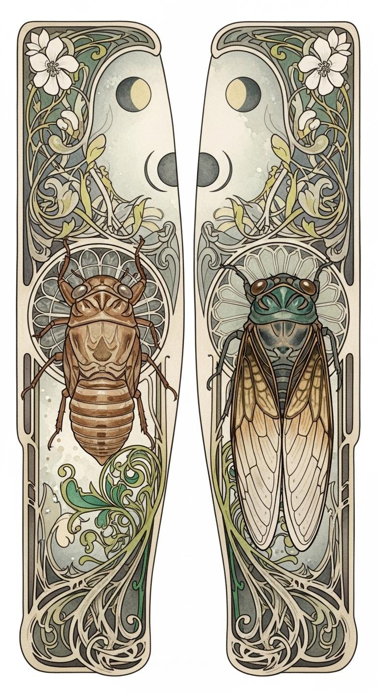 Cicadas, with their distinctive exoskeletons and melodic calls, serve as powerful symbols in Art Nouveau tattoos, representing themes of transformation and renewal.