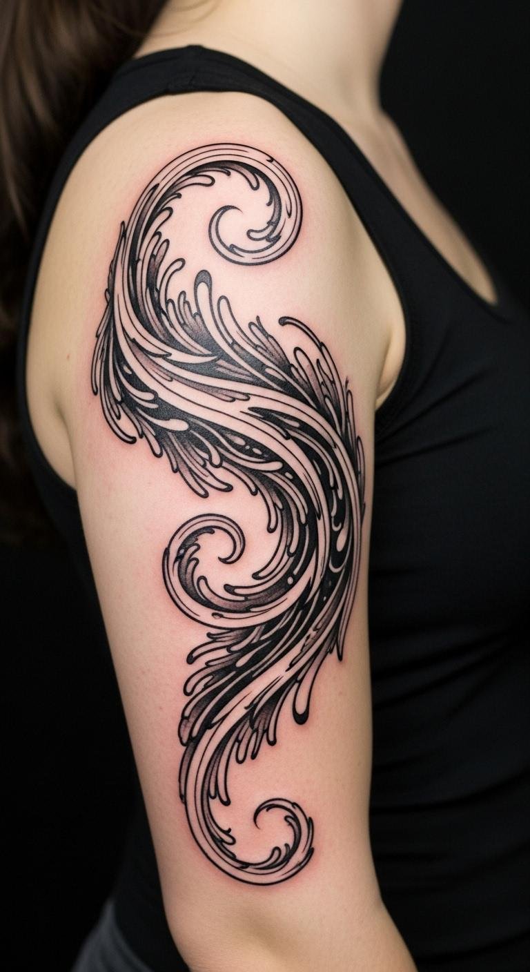 Emotionally it reads as graceful momentum—uplifting and calming at once—so ideal placements are along the forearm or ribcage to show movement with the body, or across the shoulder blade to let the curves follow musculature and breath.