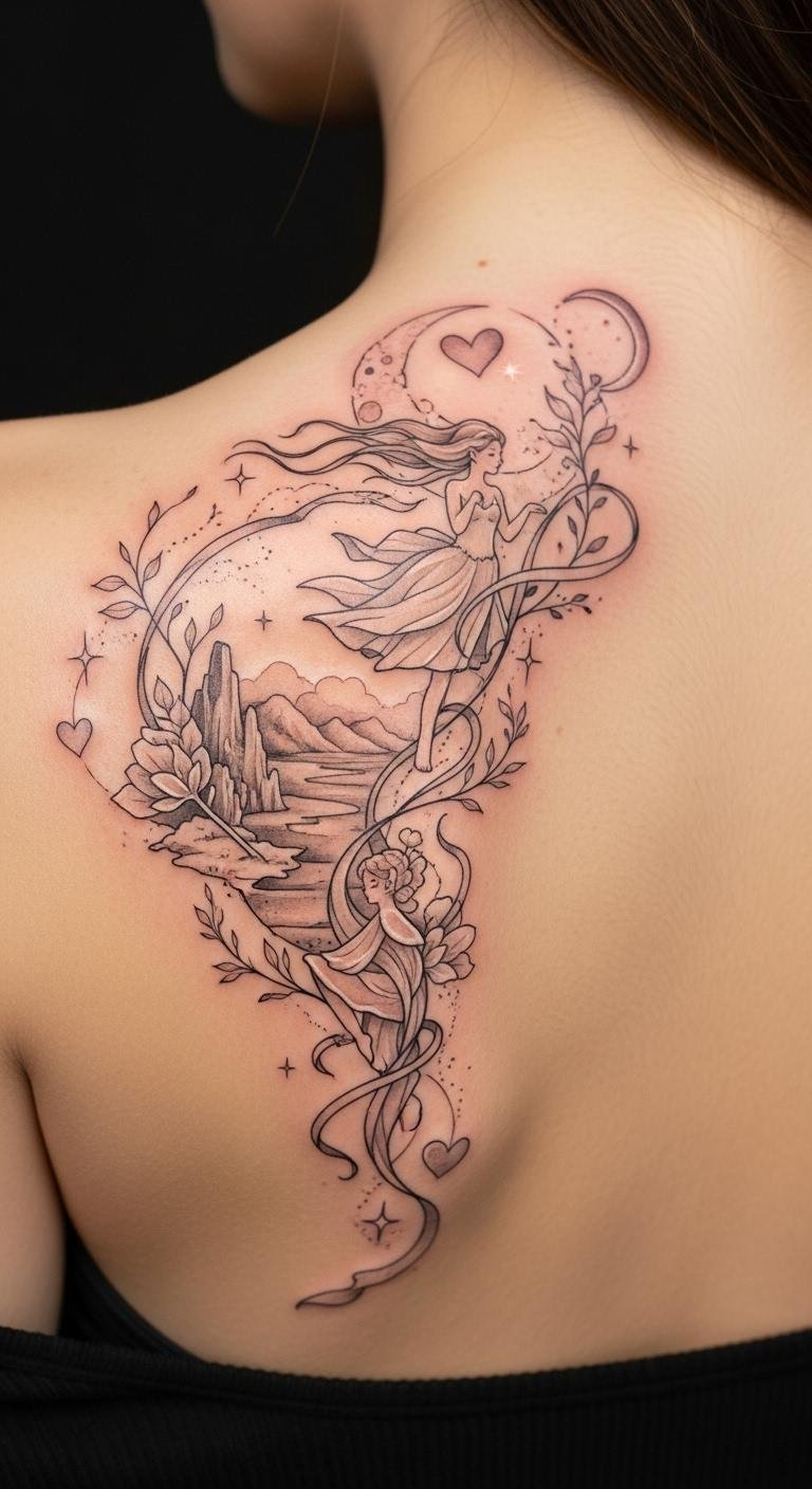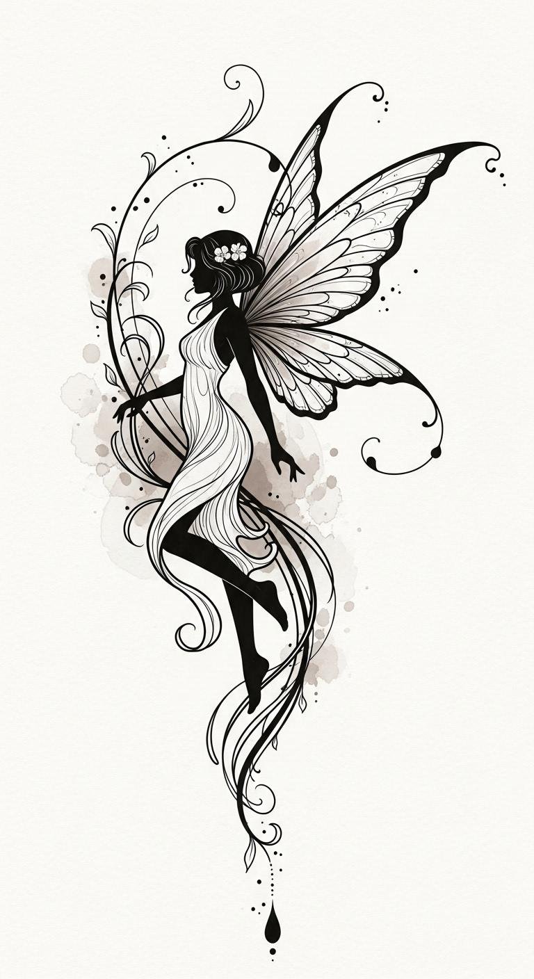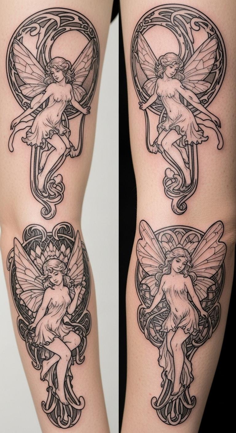 Delicate fairies and nymphs rendered in flowing Art Nouveau lines, entwined with stylized vines, lilies, and subtle crescent moons; soft muted greens, golds, and pearlescent accents; fine dotwork and filigree textures, organic negative space that follows body contours — ideal for shoulder blade, ribcage, or upper thigh. This design symbolizes a bridge between the human and the mythical, evoking wonder, liberation, and intimate communion with nature; placement along natural curves enhances movement and the feeling of the figures emerging from the skin, inviting personal reflection and quiet enchantment.