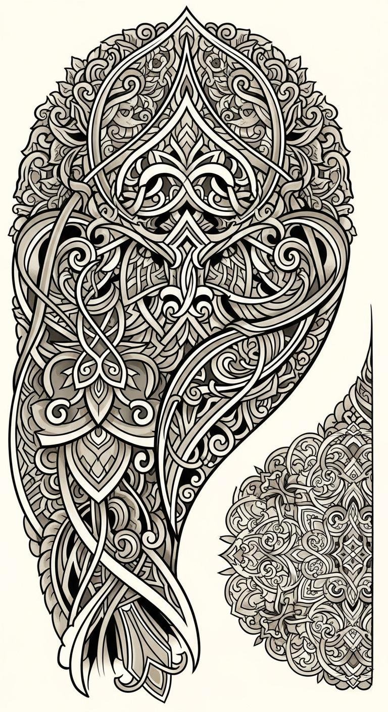 This tattoo concept takes the described arabesque patterns and translates them into a flowing, wrap-around design meant for the upper arm, shoulder blade, or ribcage—areas that allow the curves and interlacing lines to follow the body’s natural movement. Symbolically, the repeating symmetry and organic motifs express balance, continuity, and a deep bond with nature; emotionally, the piece evokes calm, refinement, and a sense of timelessness. Fine-line shading and varied line weight will emphasize depth and invite close inspection, while negative space preserves breathability and ensures the design remains elegant on skin over time.
