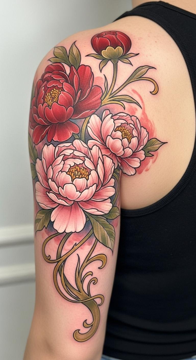 The rich reds convey passion, while soft pinks embody love and compassion. Choosing peony tattoos reflects an appreciation for beauty and the transformative power of nature, enhancing your personal narrative.