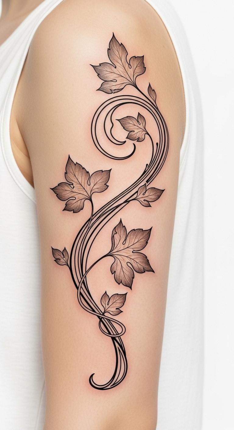 Graceful leaf and vine arrangements in Art Nouveau tattoos symbolize personal growth, renewal, and the interconnectedness of relationships; the flowing lines evoke freedom and serenity while the detailed leaves suggest resilience and seasonal change.