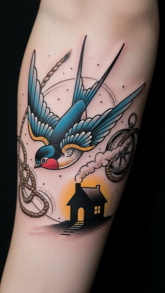 The design pairs classic symbolism with intimate emotion—the swallow’s trajectory toward the illuminated home evokes reunion and guidance; the compass and ropes subtly reference navigation and endurance.