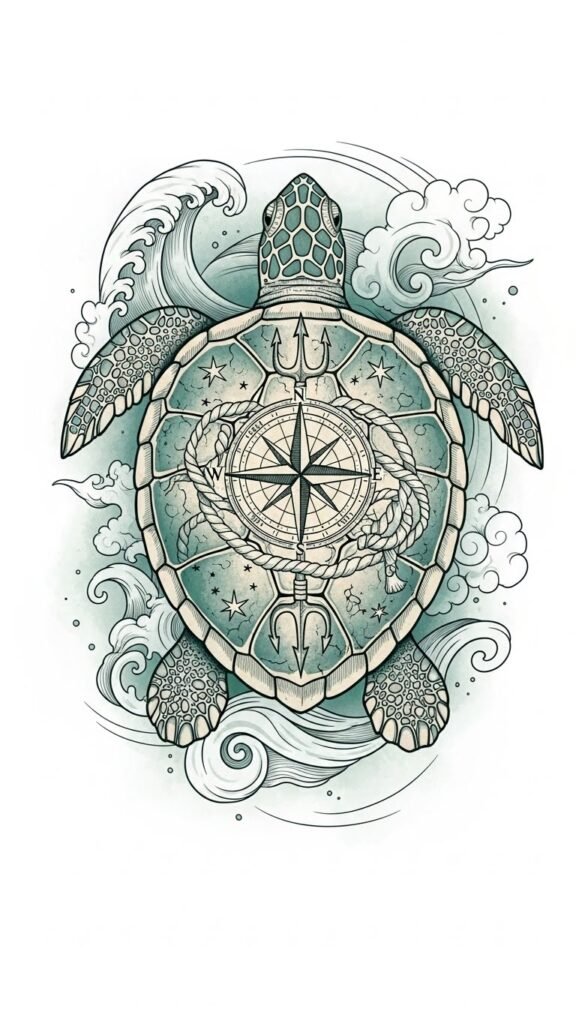 Each inked turtle embodies freedom, adventure, and the deep connection to the sea, reminding you that every voyage is a step toward personal transformation and spiritual awakening. This design emphasizes rite-of-passage symbolism—the compass and trident reference guidance and authority, rope and stars denote camaraderie and navigation, waves suggest ongoing journey and emotional depth; emotionally it evokes pride, endurance, and reverence.