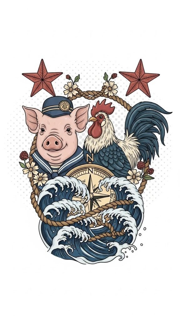 Pig and rooster tattoos serve as powerful symbols of good luck and resilience in maritime culture, each steeped in history and folklore.