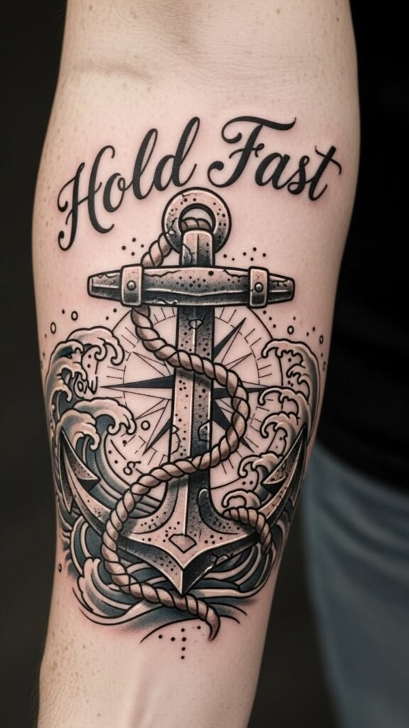 This design emphasizes steady guidance and safe return, evoking calm determination and a connection to maritime heritage; ideal placement is the forearm for visibility and personal reassurance, allowing the wave motif to align naturally with arm contours and the anchor to sit near the wrist as a subtle grounding element.