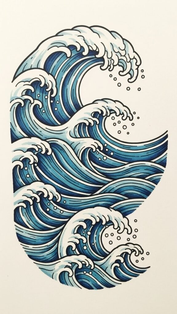 This tattoo concept uses flowing, layered wave lines with fine dotwork foam and subtle negative-space highlights to evoke motion and depth; it symbolizes resilience, freedom, and the pull of home.