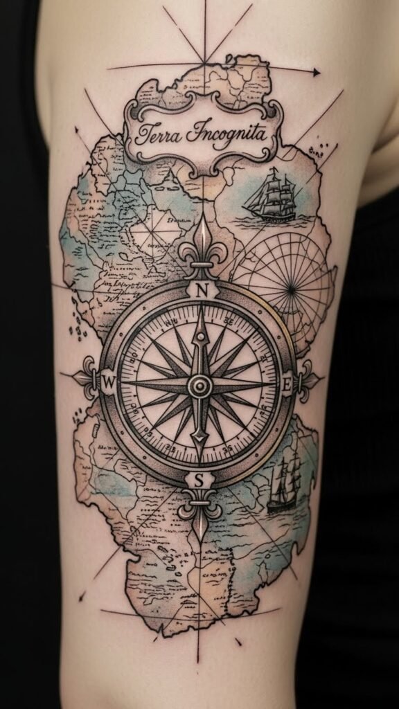 Imagine a vintage map-inspired tattoo, showcasing a vintage compass guiding you through uncharted waters, reminiscent of an ancient mariner’s journey.
