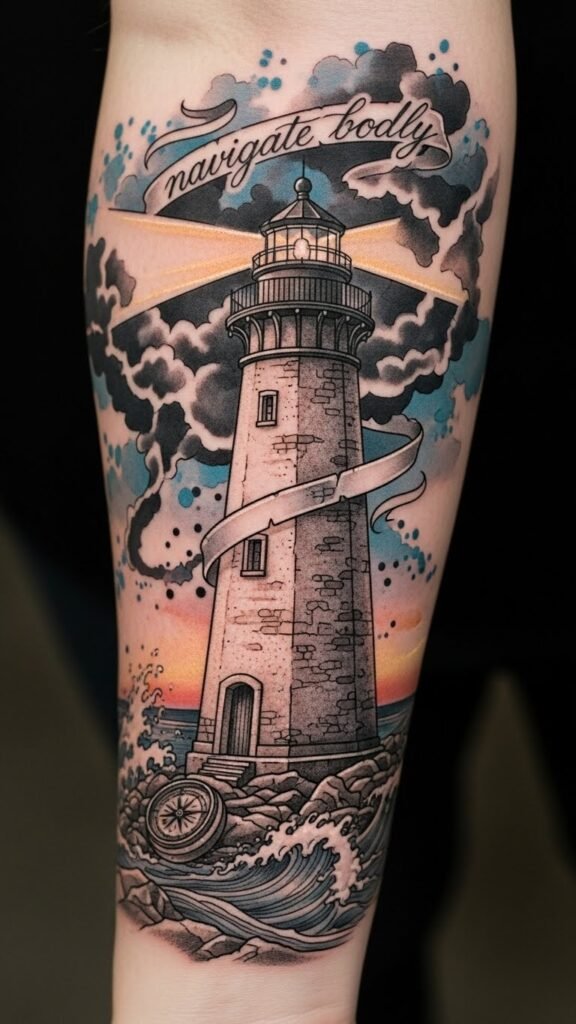 Placement follows the arm’s natural lines so the compass sits on the inner wrist for intimacy, the ship spans the outer forearm as the sleeve’s focal narrative, the kraken curls around the elbow for dynamic movement, and the lighthouse crowns the shoulder to signify hope and direction.