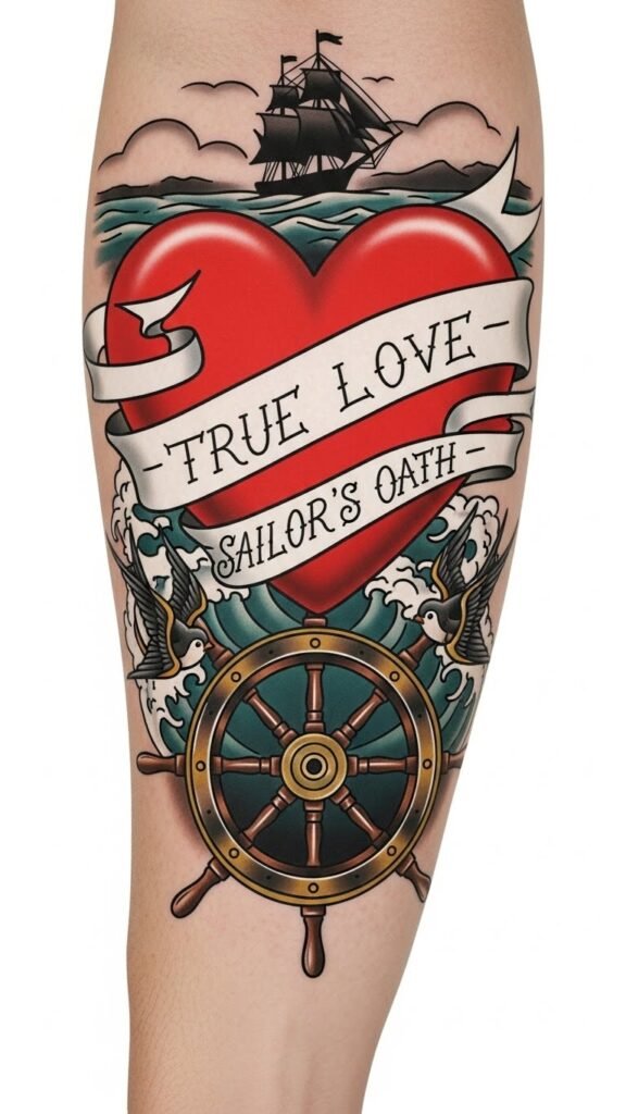 Though the sea can be a harsh mistress, a sailor’s heart with banners tattoo serves as a vibrant symbol of love and loyalty, embodying the deep connections forged both at sea and ashore.