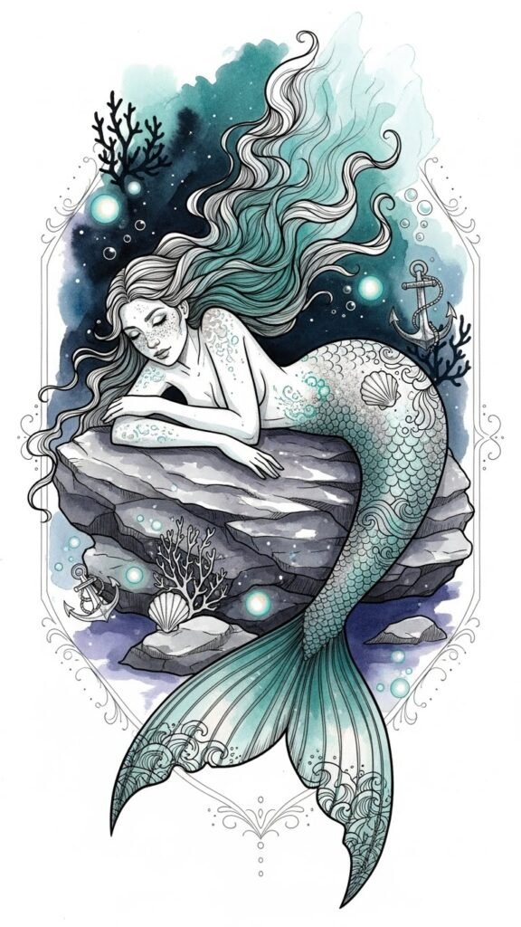 This design emphasizes duality—mystery and comfort—using bioluminescent highlights to convey hope and dark tones to suggest the unknown; it fits the upper arm or shoulder blade to allow flowing hair and tail to curve with the body’s movement, evoking emotion and personal symbolism while incorporating small nautical elements for added storytelling.
