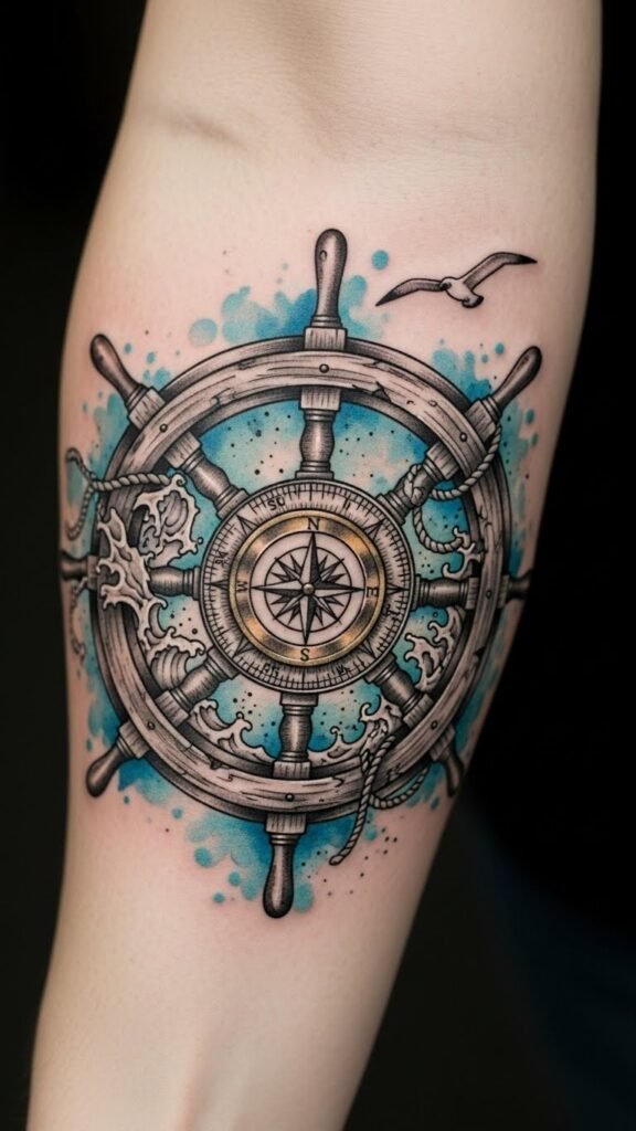 With intricate designs, these tattoos reflect steering navigation techniques, reminding you to embrace challenges and chart your own course, no matter how turbulent the sea may become. This forearm placement allows the wheel to sit where it can be seen as a constant reminder of resilience and direction, evoking steady determination and calm confidence while the watercolor background adds emotional depth and movement.