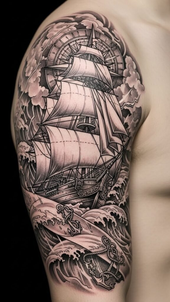 Embrace designs that depict ships battling tempestuous waves, reminding you of your strength. Each inked wave signifies not just survival, but the freedom found in maneuvering life’s storms. This design channels that imagery into a wearable emblem of endurance and hope—place it on the upper arm to suggest forward motion and protection, across the chest to keep the metaphor close to the heart, or as a wrap on the ribcage for a more intimate, personal statement.