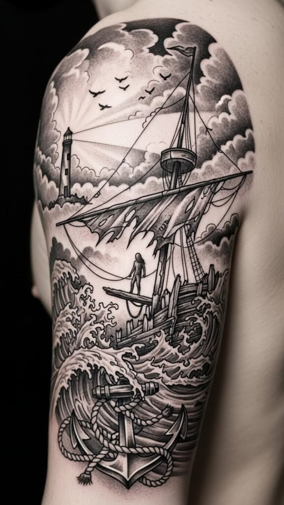 Each tale of resilience inspires your next ink adventure, reminding you that freedom often emerges from the depths of turmoil. The design symbolizes resilience (figure and plank), guidance and hope (lighthouse beam), and liberation (birds), using storm-to-light transition to evoke emotional catharsis; ideal on the upper arm, shoulder blade, or full chest where vertical movement and detail can be fully appreciated.
