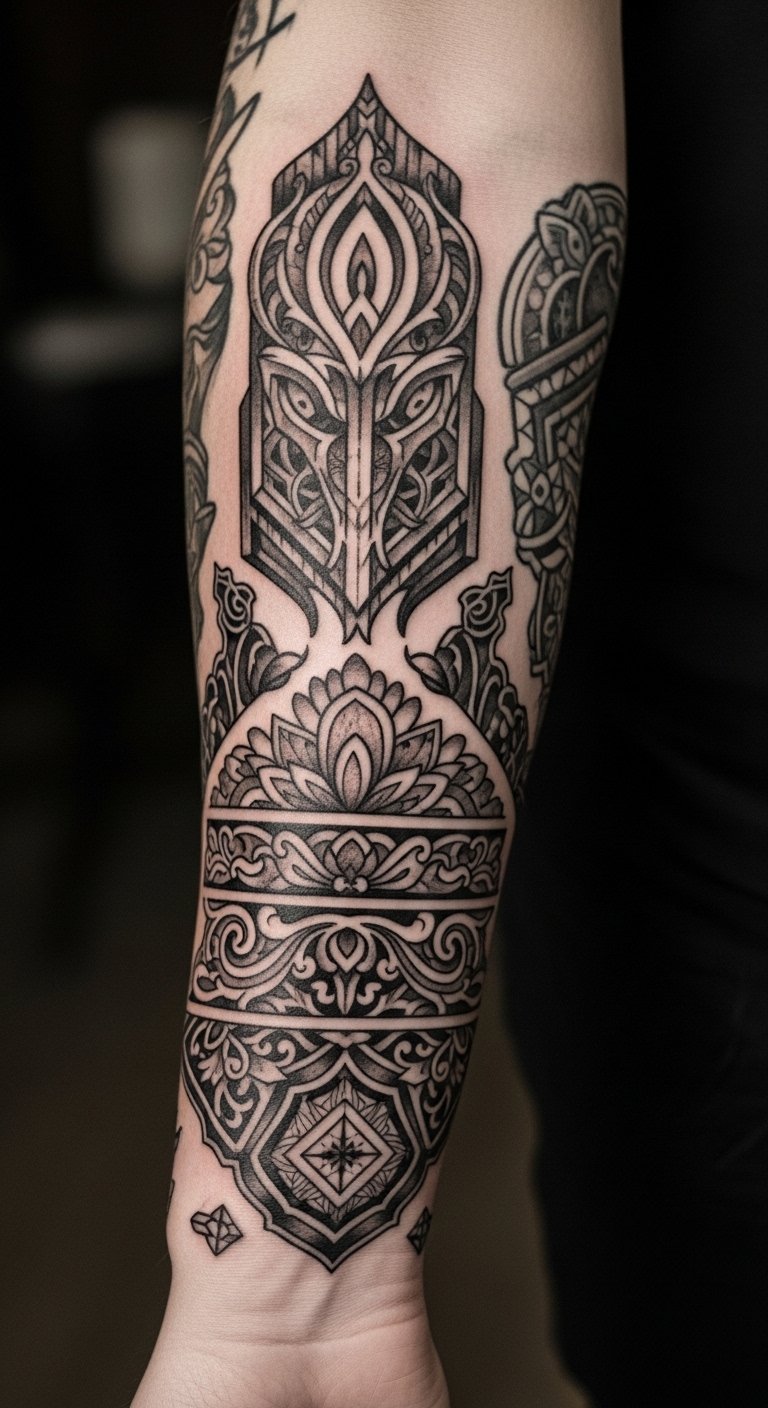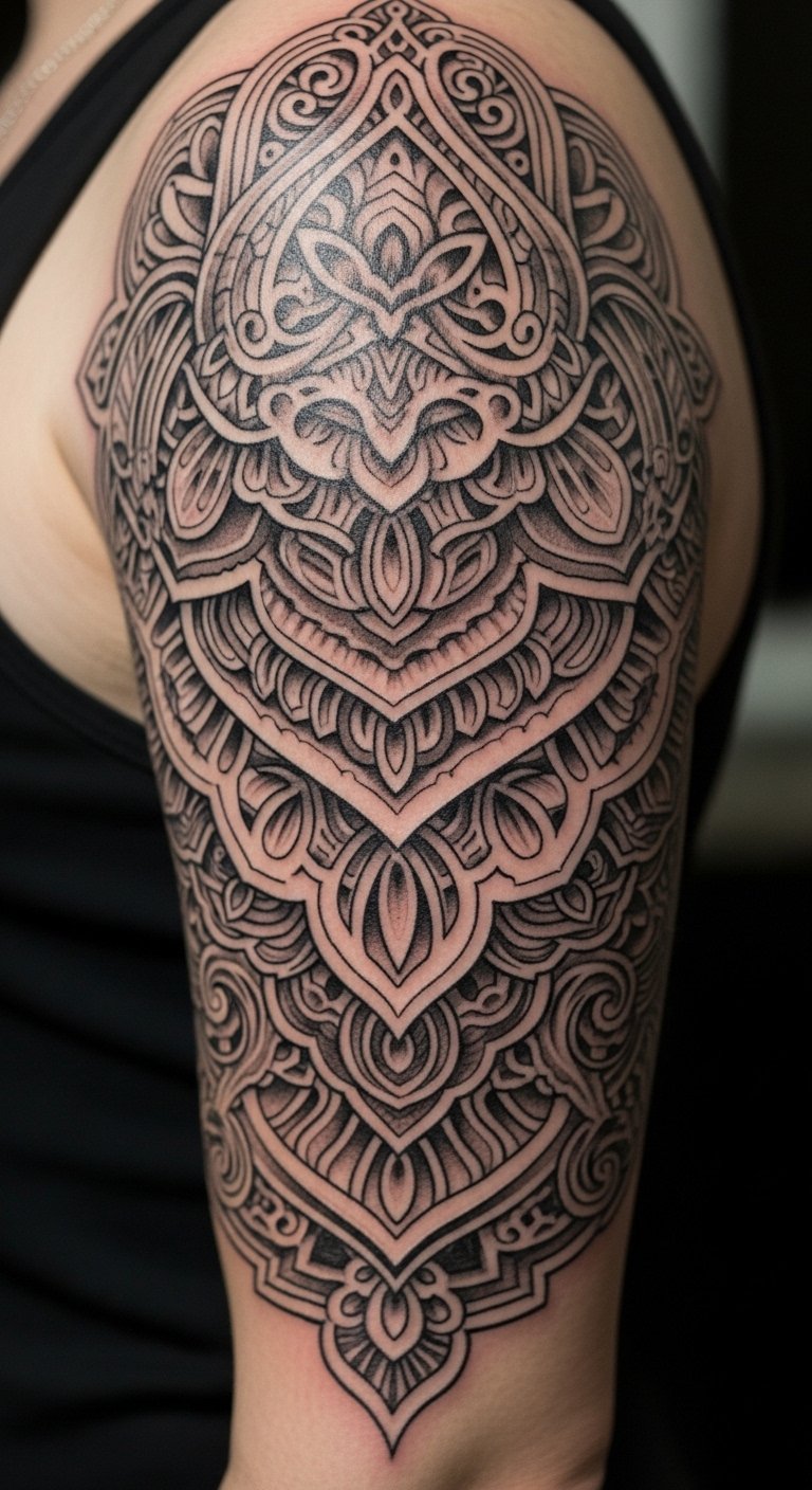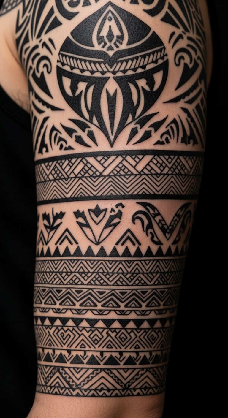 This design symbolizes lineage, resilience, and personal journey—each line a link to ancestors—evoking pride and quiet strength; ideal placement is a shoulder-to-forearm wrap that reads coherently both in motion and at rest, allowing the wearer to display heritage prominently or partially conceal it as desired.