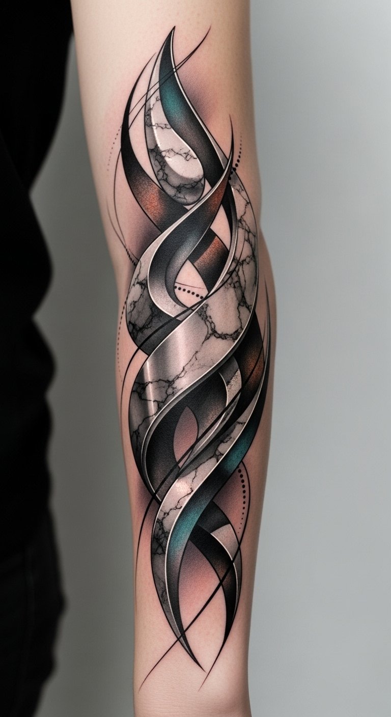 A forearm or upper chest piece that blends impossible geometry and anamorphic shadowing: a Möbius strip that appears to twist off the skin, tessellated birds morphing into stairs, and negative-space curls revealing hidden faces—rendered in high-contrast black and soft gray with fine dotwork for texture. Symbolically, the design represents perception versus reality and personal transformation; emotionally it evokes curiosity, playfulness, and a touch of mystery. Placement on the forearm, ribcage, or shoulder allows movement to animate the illusion, inviting viewers to change perspective literally and figuratively as they walk around the wearer.