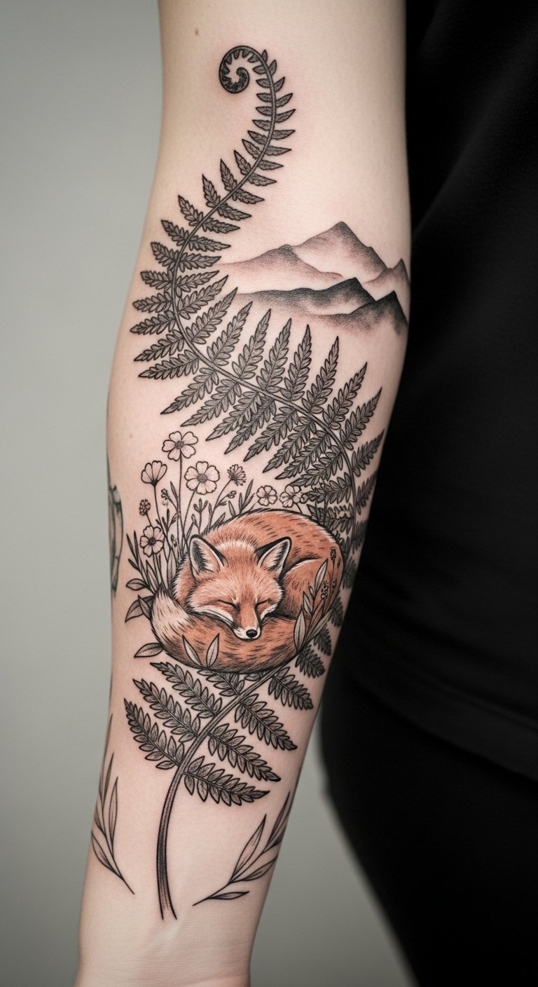 Symbolically, the fern suggests growth and resilience, the fox embodies freedom and adaptability, and the mountains and seasonal wildflowers nod to cyclical change; together they create an emotional blend of groundedness and spirited exploration.
