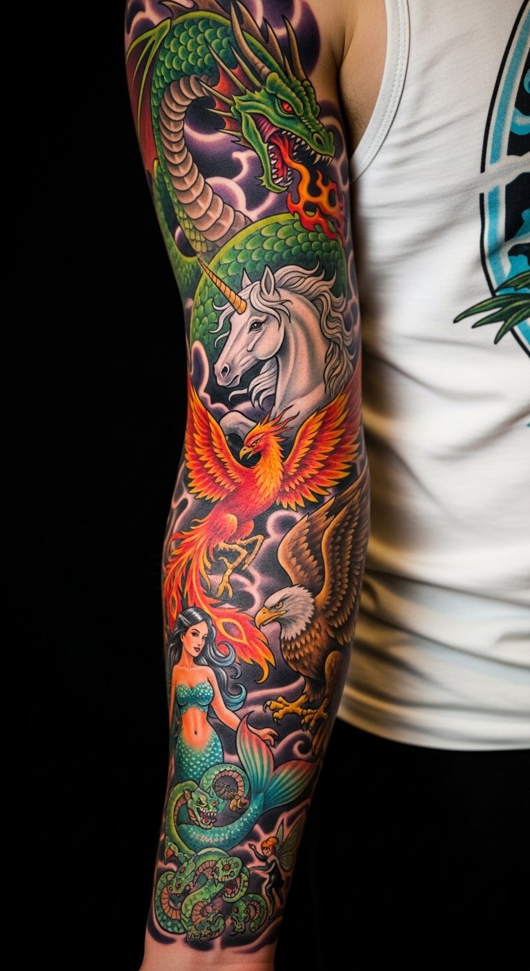 Combine the listed creatures into a flowing chimera sleeve: a dragon’s serpentine body coils from shoulder to wrist, flames blending into a phoenix’s rising wings across the bicep; a unicorn’s horn and gentle profile appear near the inner forearm, while a mermaid’s tail curls around the wrist; griffin talons guard the elbow, hydra heads peek from layered scales, and small fairies hover between elements.