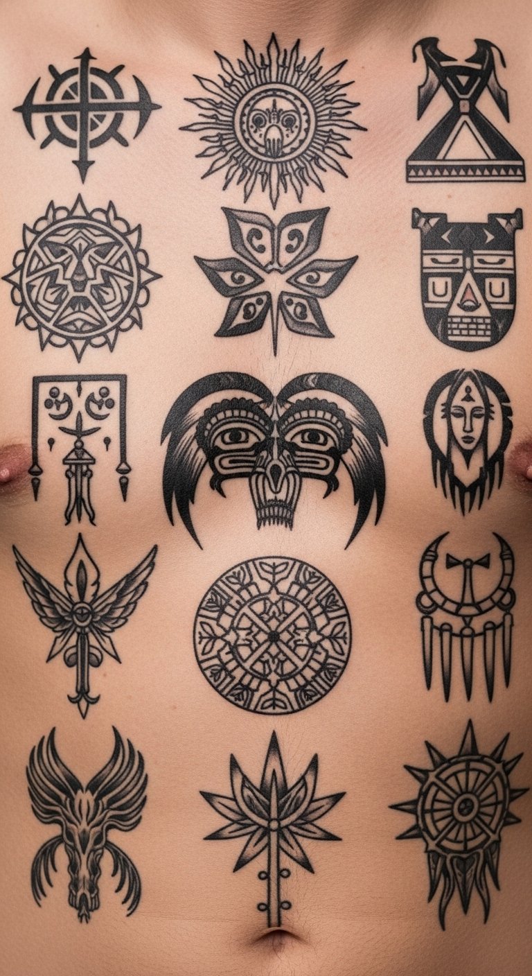 As a tattoo design concept, imagine a flowing sleeve or back piece that layers traditional motifs—interlaced patterns, ancestral figures, and ritual symbols—with modern linework and watercolor washes; symbolism highlights lineage, spiritual resilience, and communal ties, evoking pride and introspection while honoring craft and regional styles; emotionally it feels reverent and empowering, bridging past and present; ideal placement: forearm to shoulder for visibility and narrative flow, or full back to allow expansive storytelling and detailed technique.