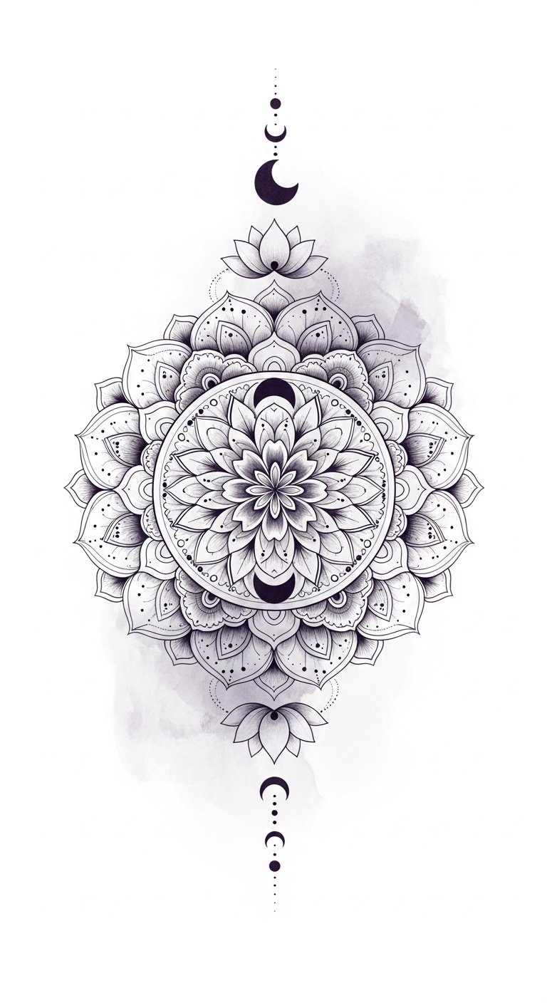 The design uses the original text as its literal seed, translating its phrases into visual elements: looping curves and layered petals echo “each curve and detail,” concentric rings and interlocking patterns embody “harmony and unity,” and integrated crescent and lotus accents reflect “freedom and self-discovery.” Emotionally the piece aims for calm introspection and gentle empowerment, a meditative focal point that invites breathing and reflection. Placement across the upper back or centered on the chest allows the mandala to sit over the heart or spine, reinforcing themes of inner balance and personal journey while providing a canvas large enough for intricate dotwork and subtle color washes.