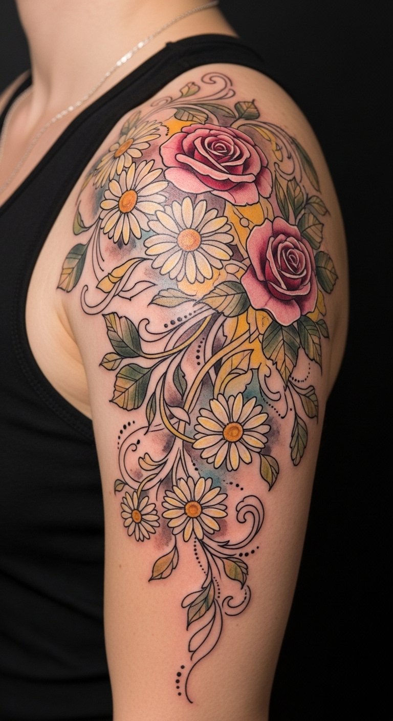 From delicate daisies to bold roses, these designs celebrate life, growth, and freedom, allowing you to express your spirit and love for the natural world. Place the design across the shoulder and upper arm where the cascading arrangement complements movement; the daisies symbolize innocence and new beginnings, the roses convey passion and resilience, and the intertwining vines represent continuity and personal growth, evoking warmth, renewal, and a serene confidence.