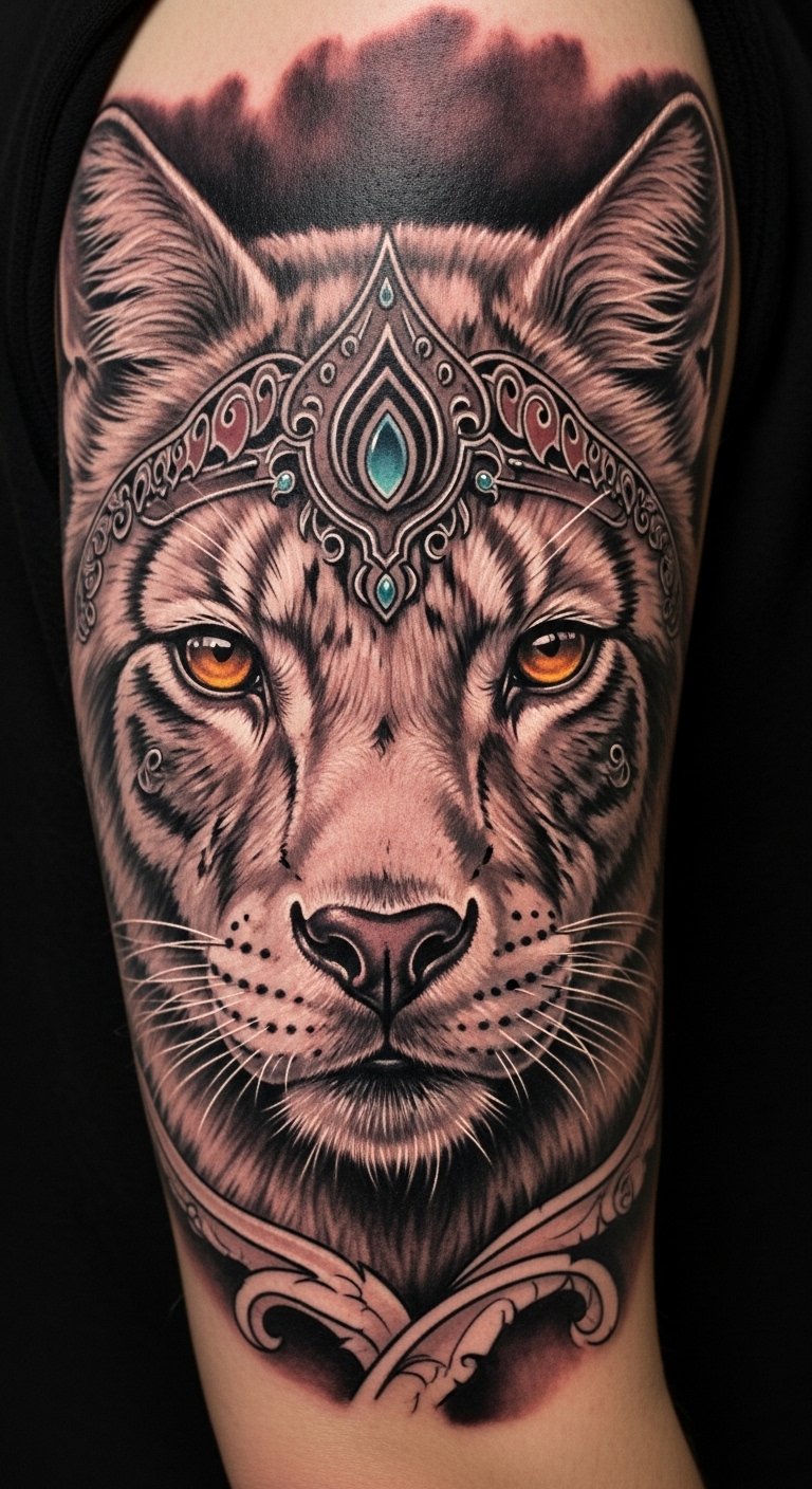 A tattoo concept centered on a realistic animal portrait intertwined subtly with floral elements—detailed fur or feathers rendered with fine-line realism, eyes conveying emotion and depth, soft blossoms and leaves framing the subject to echo the earlier floral exploration; ideal placement across the upper chest, shoulder, or full forearm where the portrait can follow body contours and be scaled for visibility.