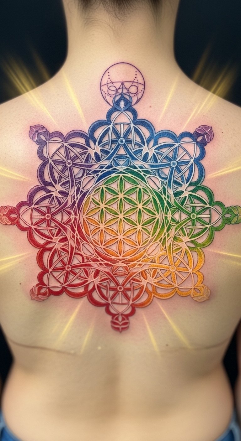 A forearm or upper back tattoo incorporating an intricate mandala built from overlapping sacred geometry (flower of life, Metatron’s cube) radiating outward into stylized chakra sigils aligned along a central spine of light; fine-line dotwork and soft watercolor washes in corresponding chakra hues evoke calm and balance. Symbolically this design represents the union of cosmic order and personal transformation, inspiring introspection and a sense of divine connection; emotionally it offers grounding and upliftment, suitable for placement along the spine for spiritual alignment or the forearm for visible daily reminders.