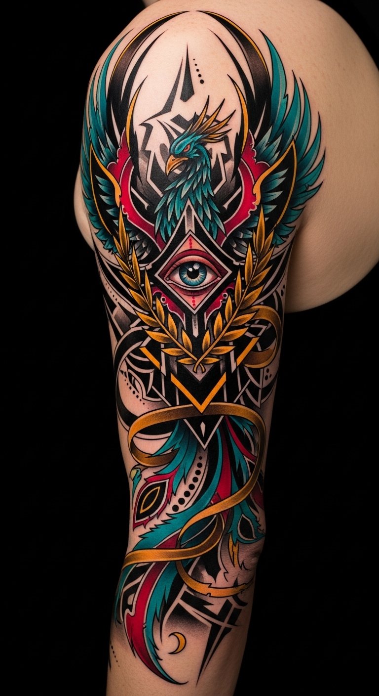 Ideal placement is a full sleeve to allow the rise and flow of the phoenix along the arm, or an upper-back piece to create a bold central statement that radiates outward, using contours of the body to enhance movement and impact.