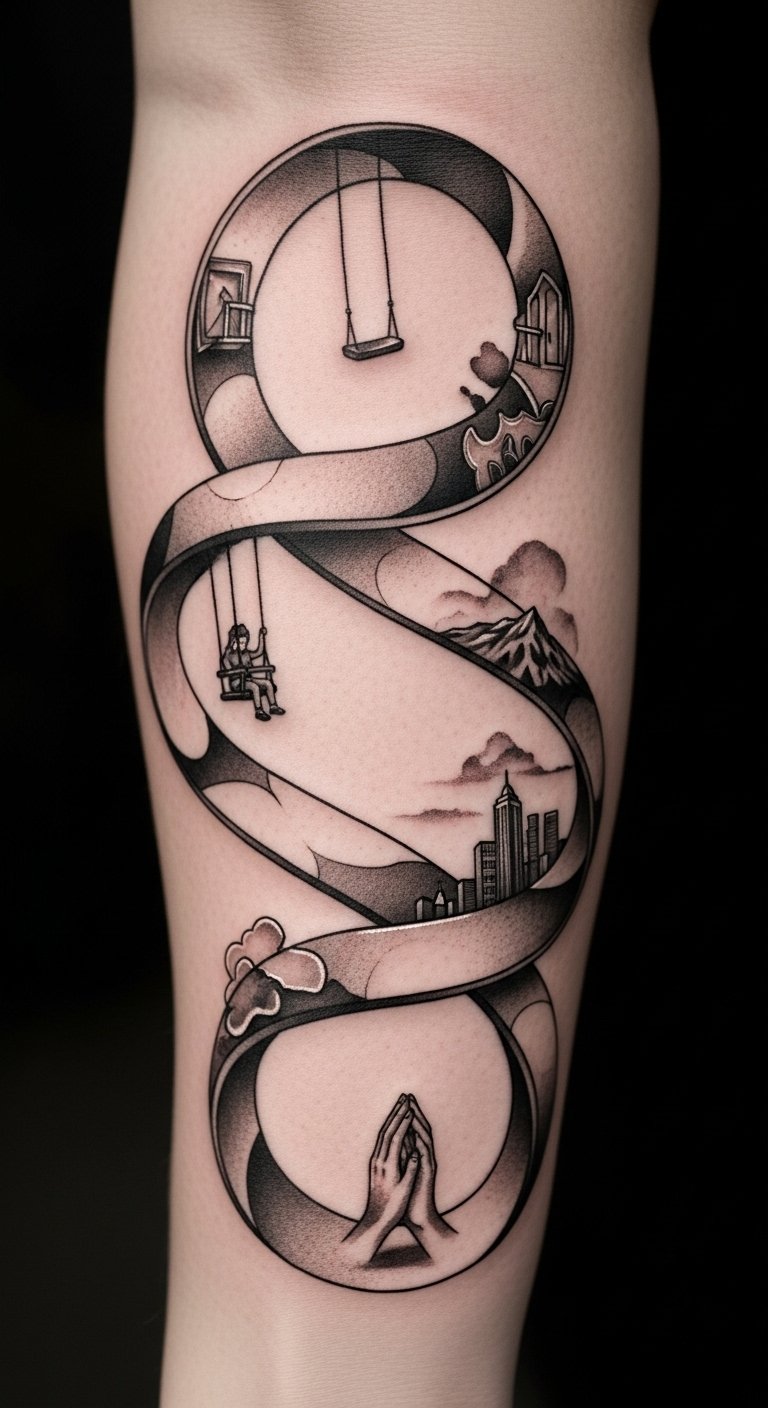 This design uses the Möbius illusion to symbolize continuity and the interconnectedness of life chapters; the miniature vignettes represent distinct memories and aspirations. The muted watercolors add emotional resonance without overpowering the fine-line detail, and the forearm placement allows both visibility and intimacy—easily shown or covered—so the wearer can share personal narratives or keep them close.