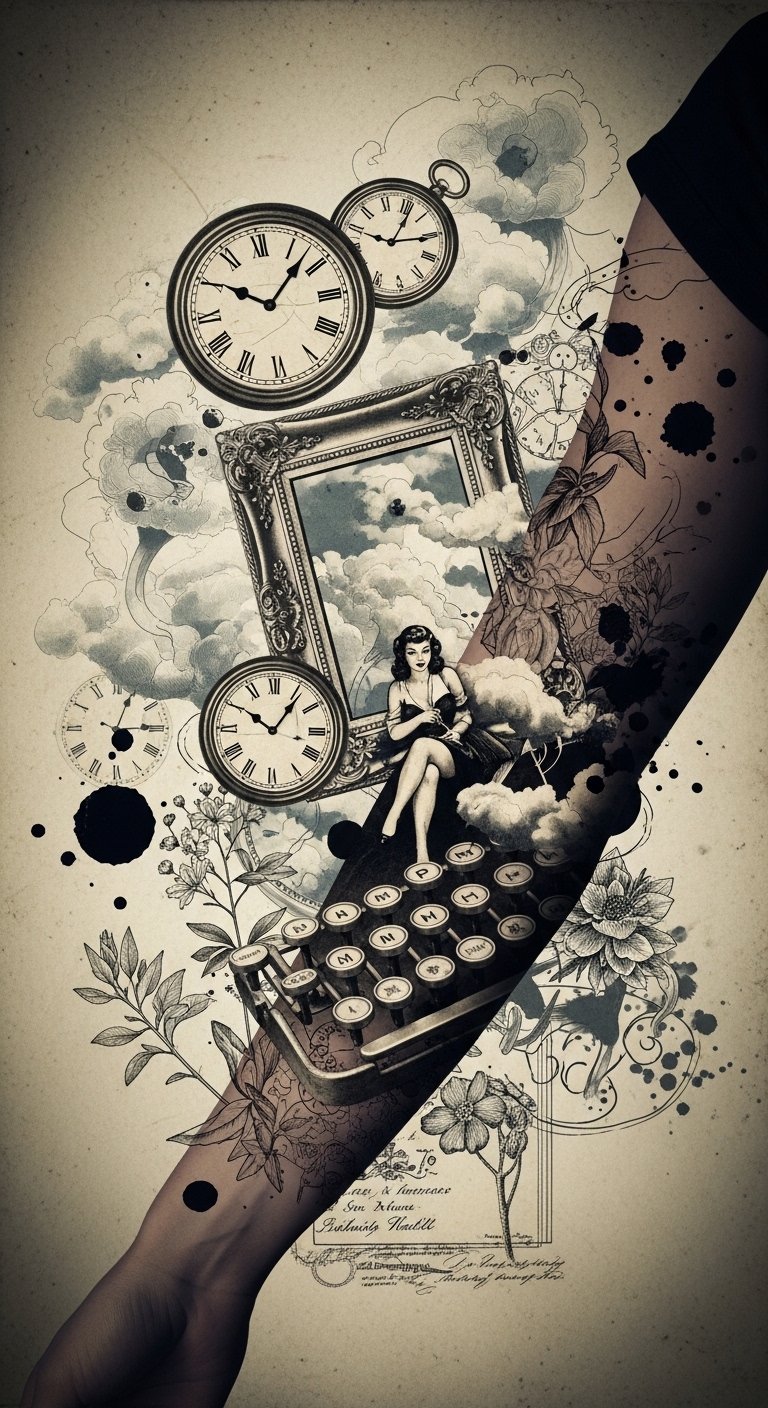 The suggested placement on the forearm or upper arm lets the wrap-style composition flow with the body’s contours. The antique clocks symbolize the passage of time, the pin-up silhouette and botanical engravings evoking personal memory and femininity or classic glamour, while the typewriter keys represent narrative and self-expression.
