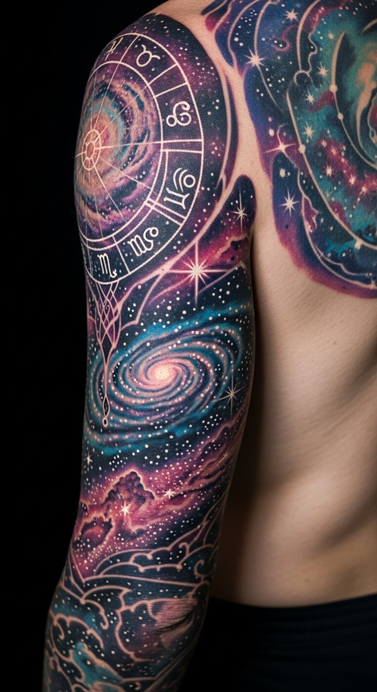 A wrist-to-forearm tattoo that begins with a small crescent moon near the inner wrist, evolving into a flowing nebula of watercolor blues, purples, and faint pinks that wraps gently around the forearm; stardust trails in fine white ink scatter outward to form subtle constellations corresponding to personal astrological signs, while a delicate comet arc leads the eye upward toward a tiny cluster of planets near the elbow.
