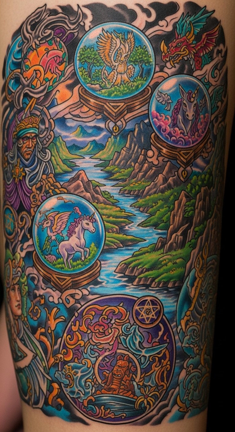 When rendered as a tattoo design, this text inspires a flowing sleeve or back piece where layered vistas — misty mountains, a moonlit forest, and floating isles — blend into scenes of a dragon coiled around a rune-etched tower, a small fae perched on a sigiled sphere, and constellations forming mythic beasts; symbolism draws on transformation (the dragon), wonder and curiosity (the fae and spheres), and protection or guidance (runes and constellations).