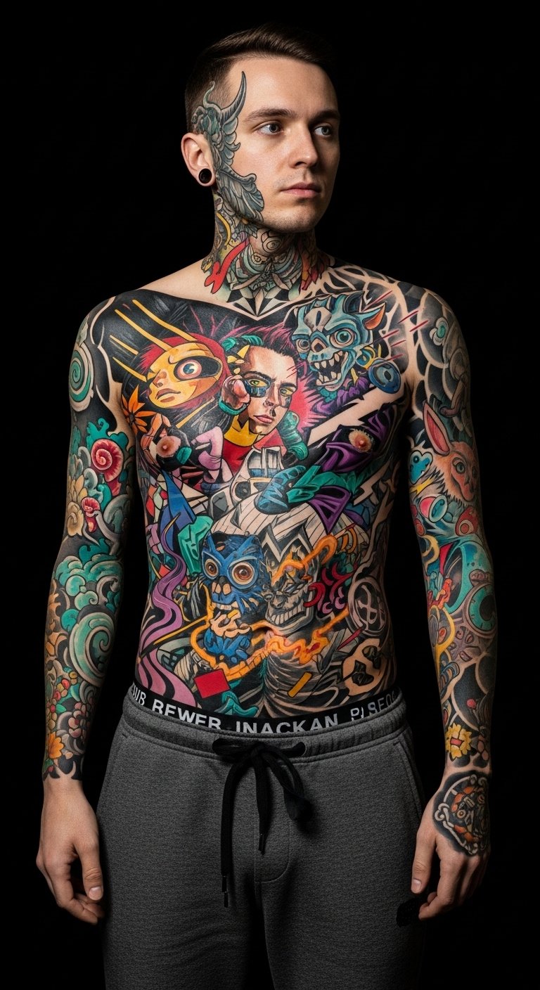 Ideal placement spans the shoulder and upper arm as a dynamic wrap, or the back as a large, immersive canvas where layered styles can breathe and interact.