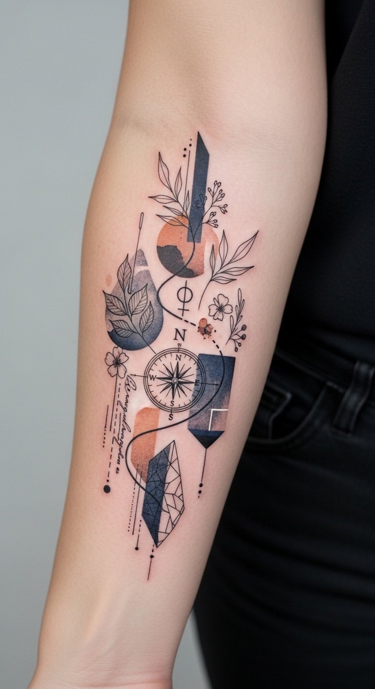 The design blends a pathway and compass to symbolize personal journey and direction, botanical elements for growth, geometric shards for life’s fractures and restored wholeness, and faint script for private vows; watercolor tones evoke memory and emotion.