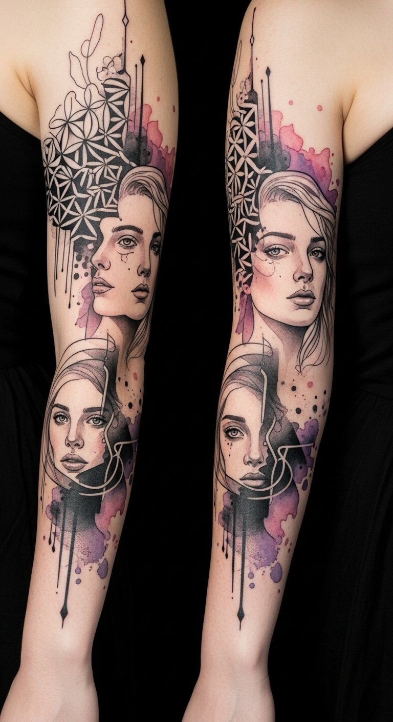 This design symbolizes unity through contrast—the geometric blackwork represents structure and technique while the watercolor and portrait elements evoke emotion and individuality; placement on the forearm or upper shoulder allows the narrative to flow with the body’s movement, inviting the wearer to share a continually unfolding story of collaboration, trust, and creative freedom.