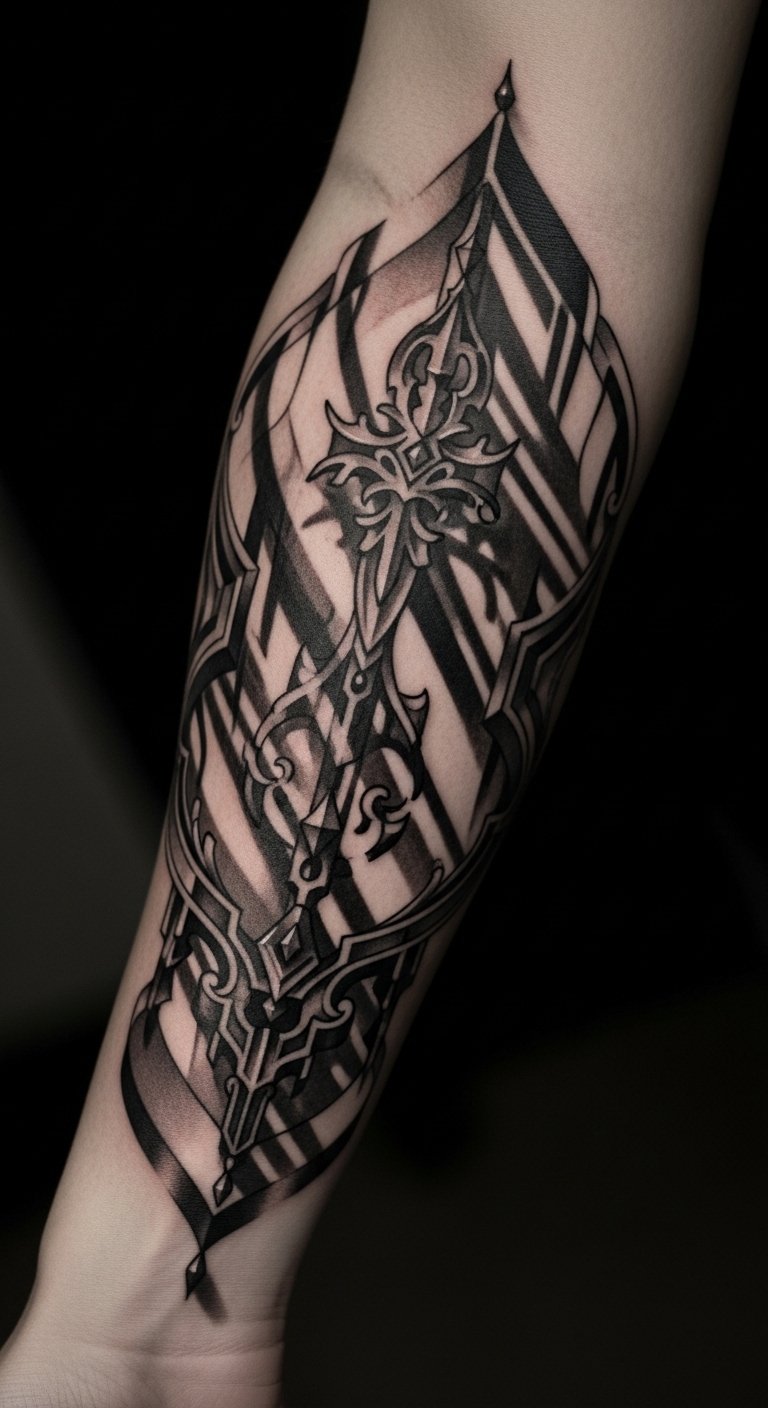 A forearm-to-shoulder tattoo that uses layered soft-black gradients and fine white highlights to simulate floating paper cutouts and drifting ribbons of shadow, evoking movement and theatrical light; symbolism centers on transformation and inner narrative—shadows as the parts of self that give form to light—inviting introspection and confident expression. Emotionally it reads as both mysterious and graceful, drawing viewers in without overpowering the wearer; ideal placements are the outer forearm for visibility or the upper back/shoulder for a broader, cinematic sweep, with curvature of muscle used to enhance the illusion of depth.