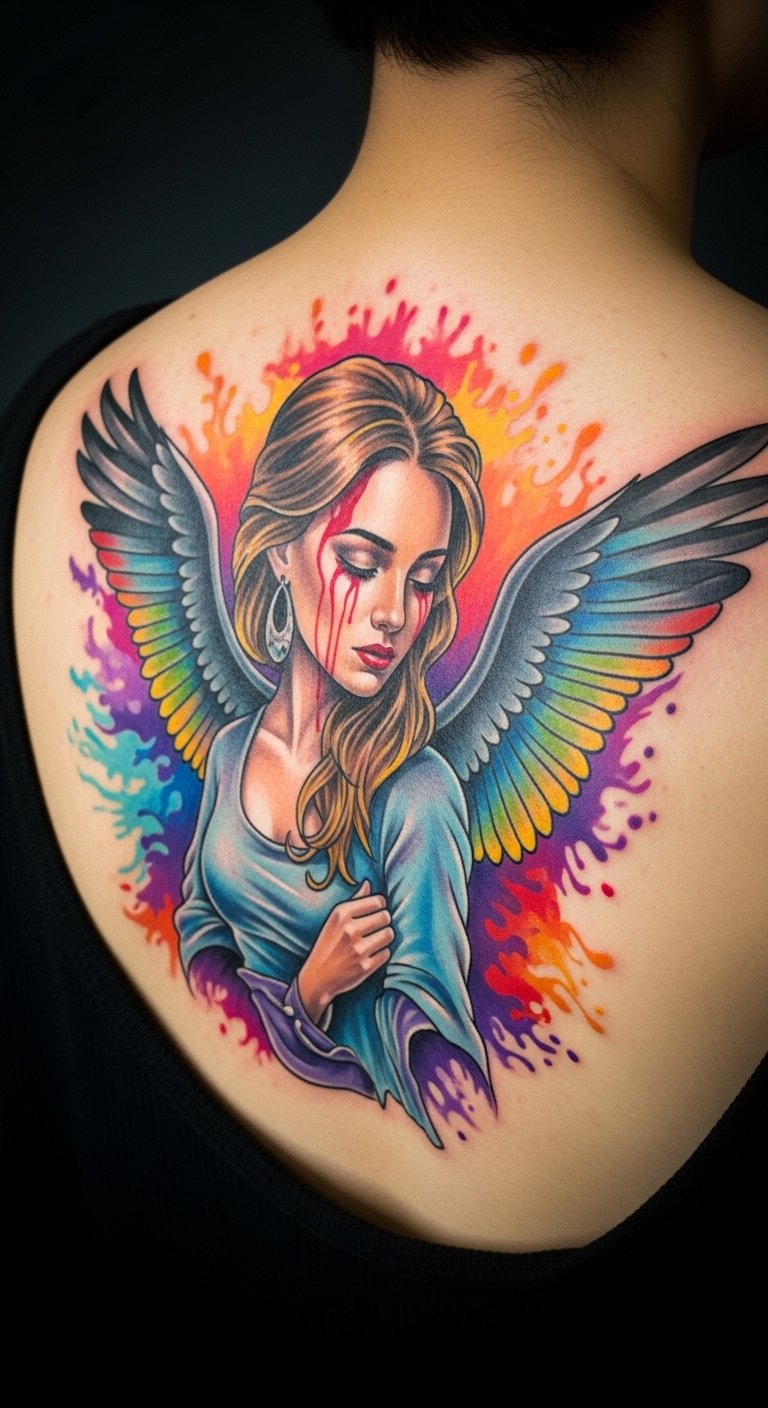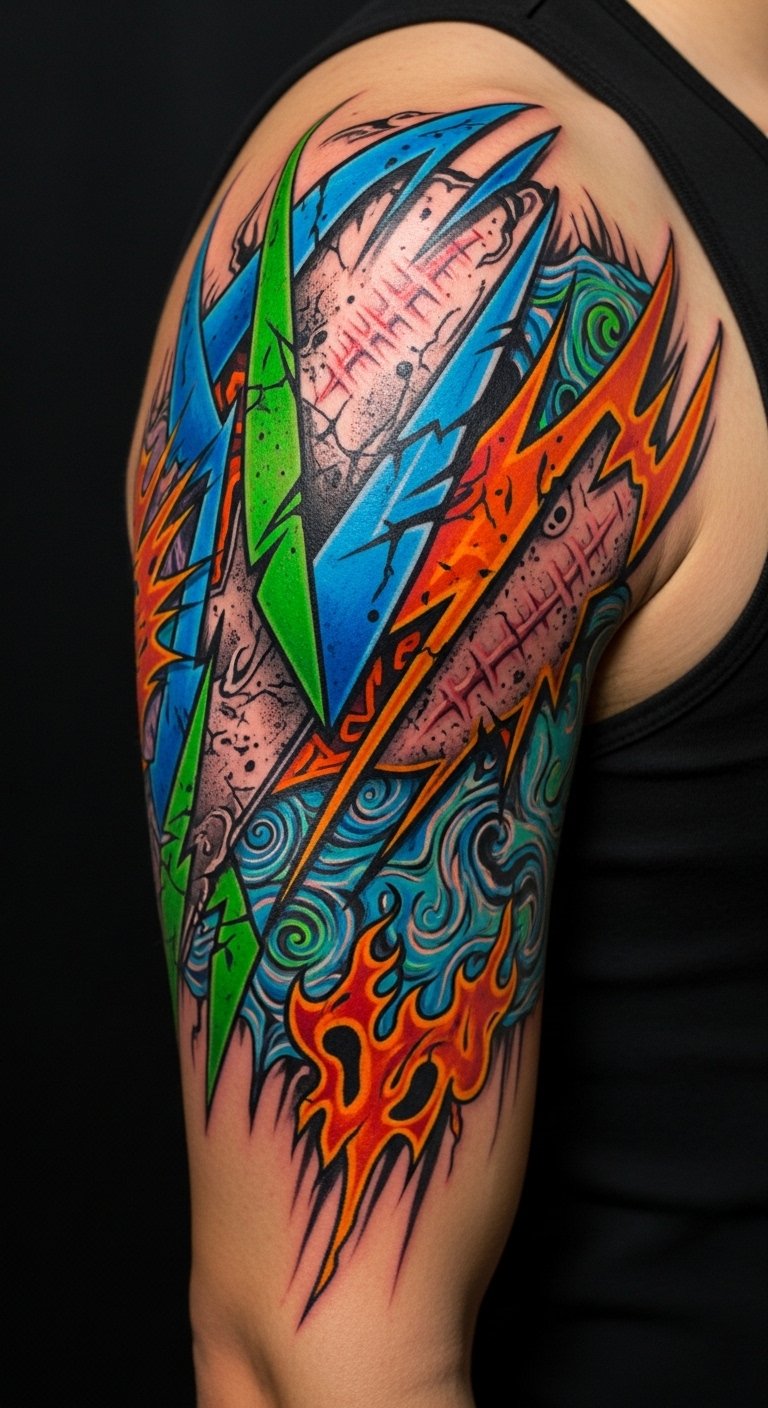 A tattoo concept built from this vision places a jagged, abstract core of clashing neon colors and inky blacks across the upper forearm or shoulder blade, where sharp geometric lines intersect with smeared, painterly textures.