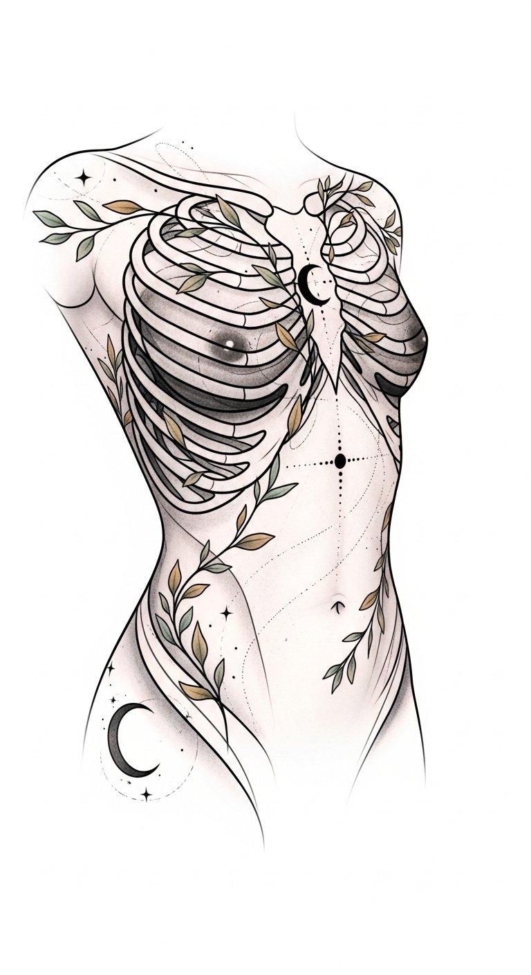 The concept pairs organic botanicals and celestial symbols with precise anatomical flow to symbolize growth, guidance, and personal transformation; emotionally it balances vulnerability and empowerment, meant to sit along the sternum and ribs where breathing and movement animate the piece.