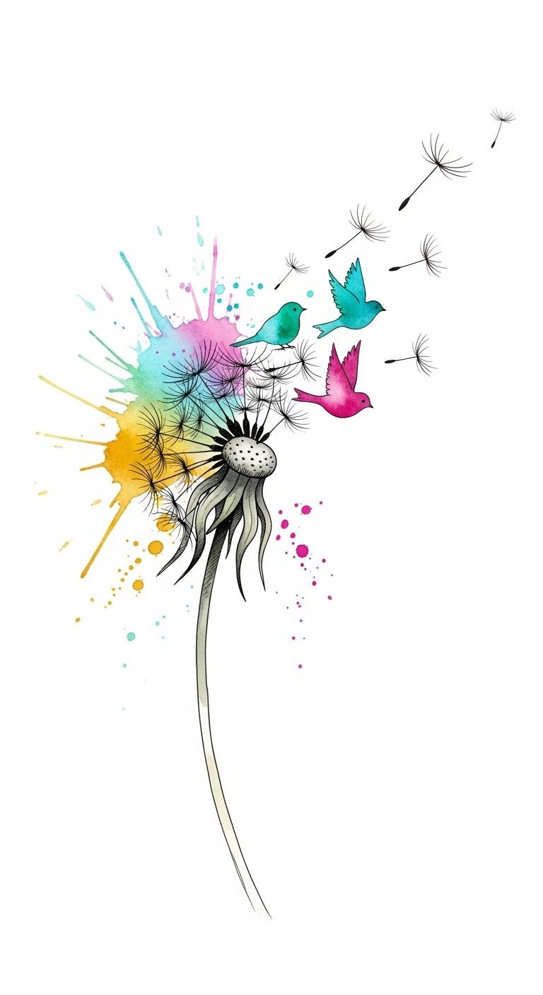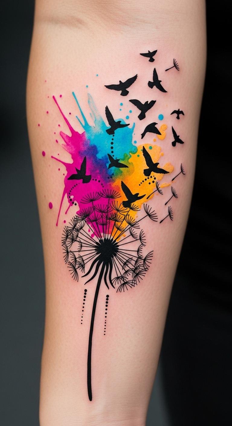 Watercolor dandelion bird tattoos burst with vibrant hues, creating a stunning visual narrative that captures the essence of transformation and freedom.
