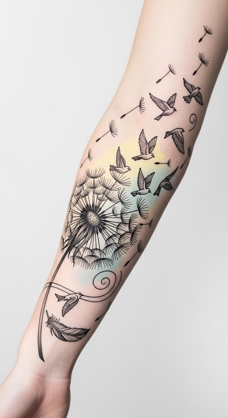 This forearm placement offers constant visibility to your dandelion bird tattoo, symbolizing your dreams taking flight.