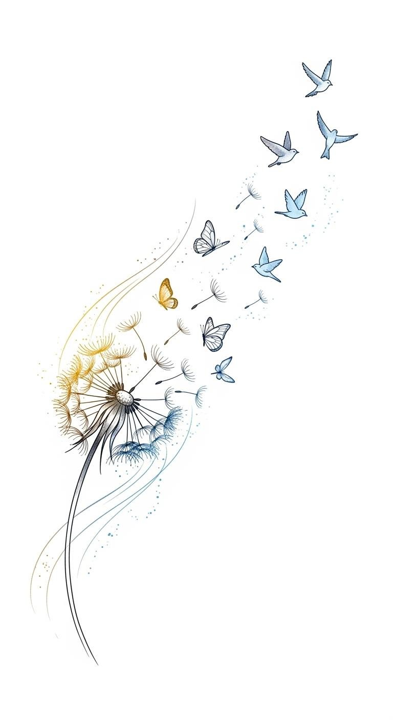 Building on the theme of transformation, combining dandelions with butterflies and birds creates a vivid tapestry of life’s journey.