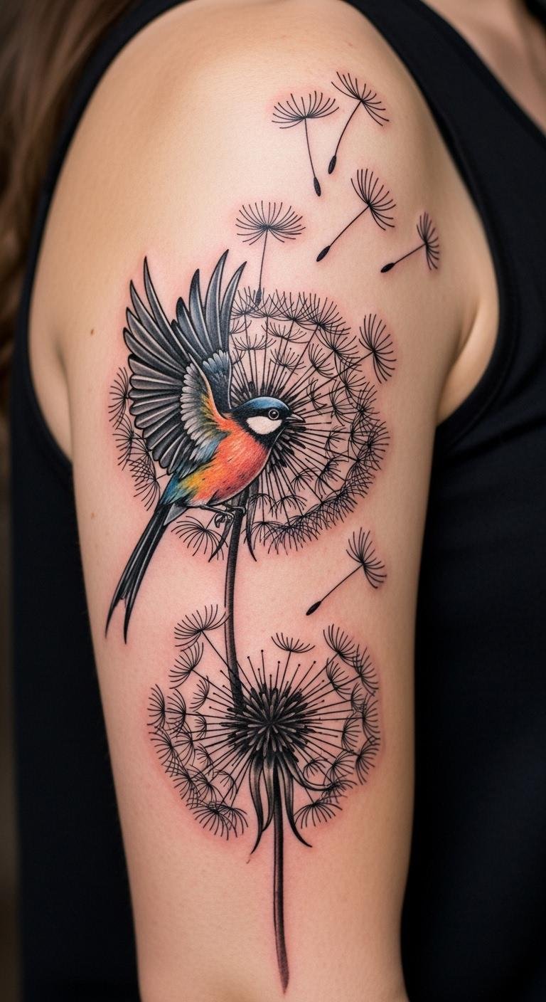 Minimalist designs capture the beauty of simplicity, but if you’re drawn to vibrant expression, a colorful dandelion and bird tattoo can ignite your spirit with energy and life.
