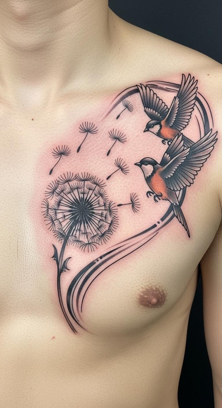 While contemplating a chest piece dandelion and bird tattoo, you’re not just choosing an artwork; you’re embracing a powerful story of transformation and freedom. This body art serves as a canvas for personal meaning, where ink design captures the essence of hope. With creative interpretation, it transforms your skin into visual storytelling, showcasing meaningful imagery that inspires you to soar beyond limits. The design places a detailed dandelion bloom at the sternum, seeds carried by a flock of small birds arcing across the upper chest toward the collarbone; delicate line work and soft shading emphasize movement and fragility, the birds rendered mid-flight to convey release and ascent, evoking renewal, courage, and the quiet optimism of letting go while the chest placement centers the meaning over the heart.