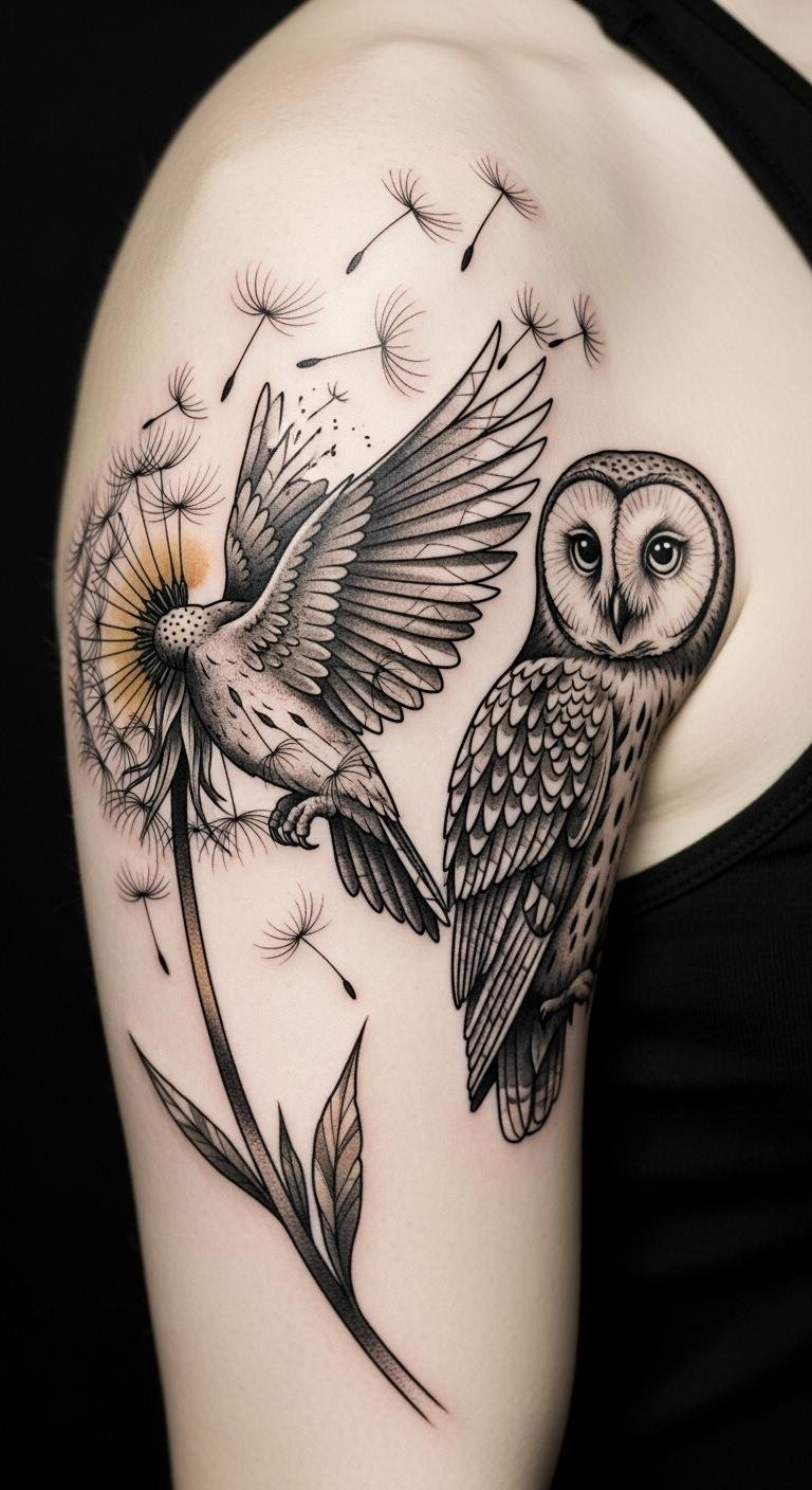 This striking tattoo design that combines a dandelion bird with an owl weaves together the themes of wisdom and transformation beautifully.