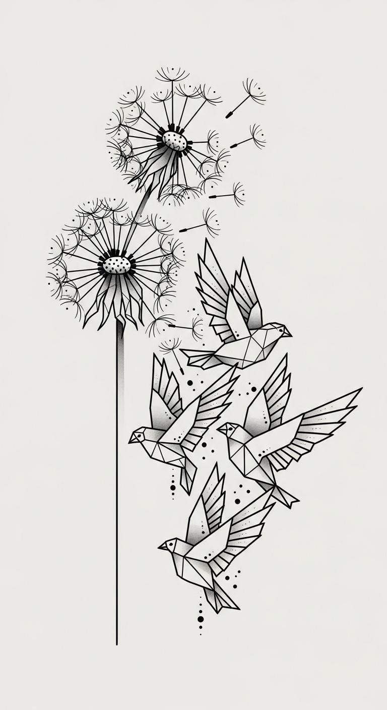 Geometric designs in tattoo art bring a modern twist to the timeless symbolism of dandelions and birds, capturing a unique blend of nature and abstraction.