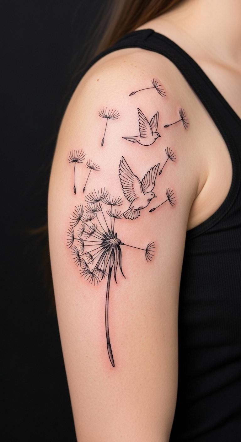 This design pairs delicate dandelion seed silhouettes morphing into small, stylized birds on a gentle diagonal airflow across the shoulder blade or forearm, using fine black lines with soft gray shading and a sprinkle of muted watercolor tones to suggest motion; symbolism centers on resilience, freedom, and dreams taking flight, evoking a bittersweet, hopeful emotion as each seed-bird departs; ideal placements are areas with natural curvature like the collarbone, ribcage, or calf so the flow complements the body’s movement.