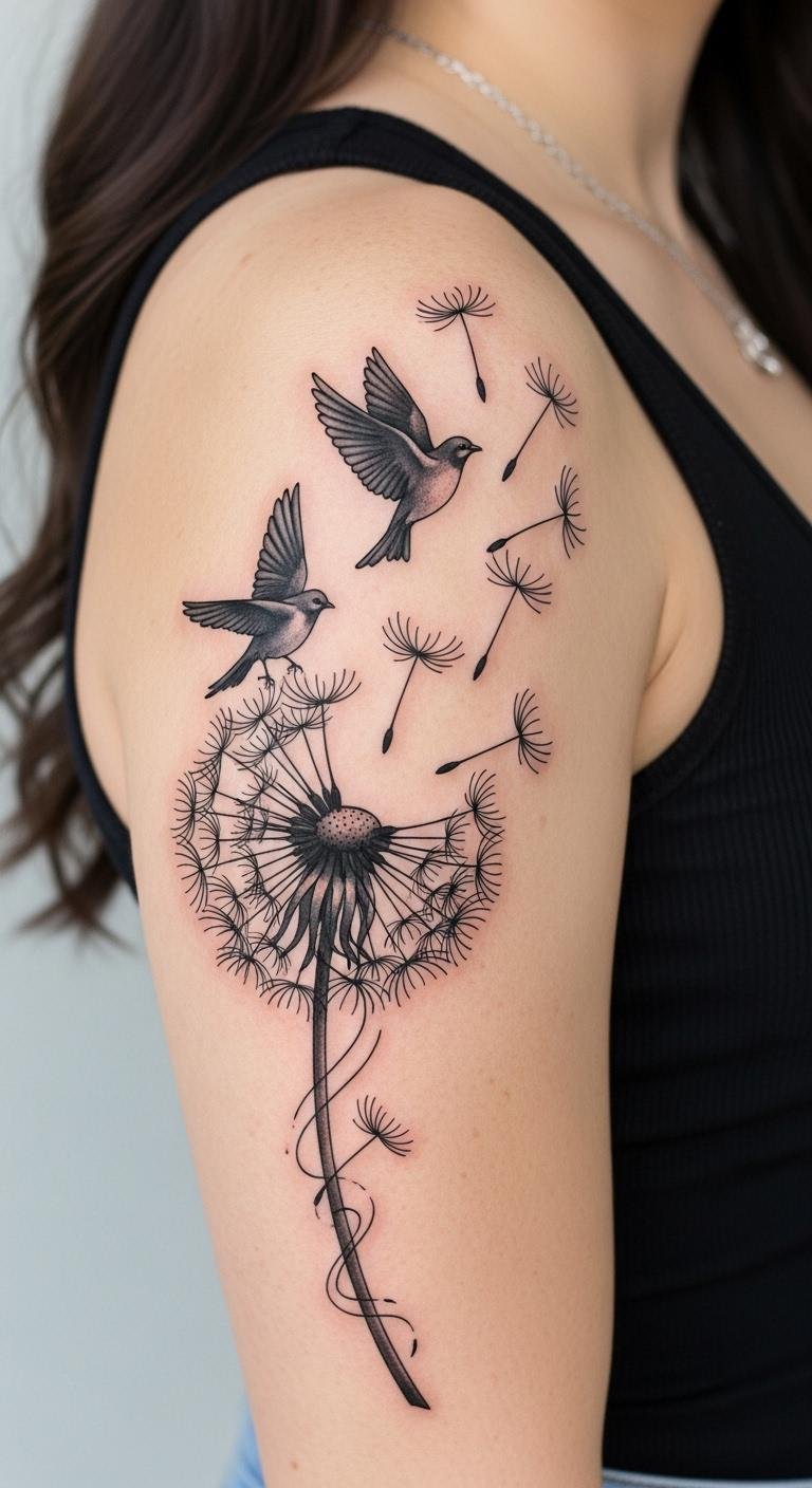 This tattoo inspiration embodies nature symbolism, capturing bird freedom and dandelion resilience. Each design reflects personal meaning and artistic expression, celebrating transformation and the liberating journey of life in stunning detail.