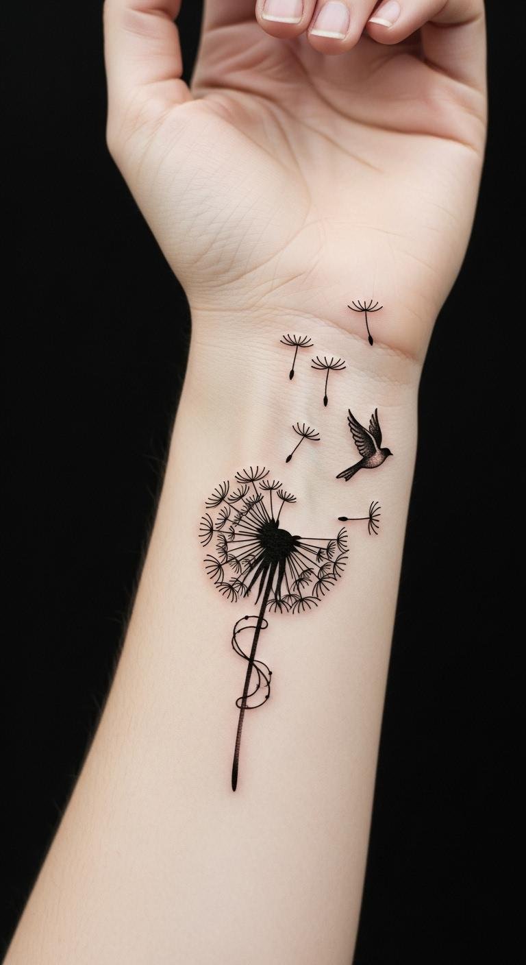 Have you ever considered how an elegant dandelion bird tattoo on your wrist can beautifully symbolize your journey of transformation?