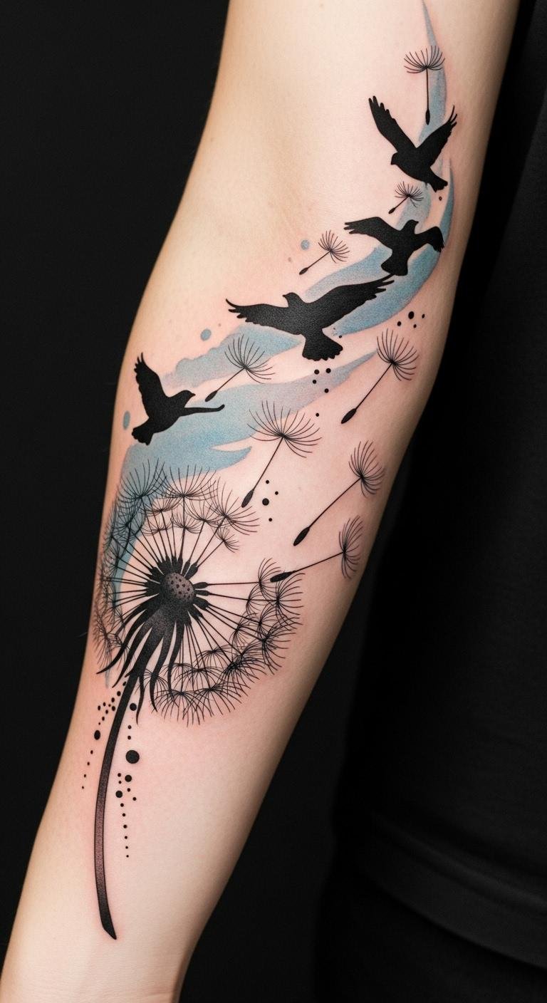 The imagery symbolizes letting go and personal growth—the dandelion rooted in grounding black linework while the seeds morph into birds rendered in lively watercolor to convey motion and liberation; emotionally it reads as joyful, hopeful, and resilient; ideal placements are the forearm or shoulder blade for visibility and flow, or the ribcage for a more intimate, personal statement.