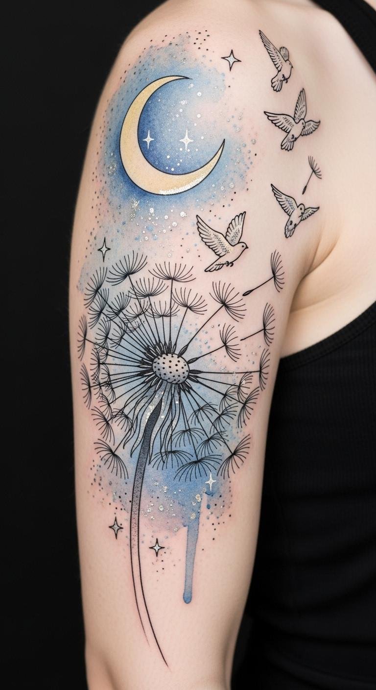 The moon’s symbolism enhances celestial themes, creating a stunning contrast with dandelion phases and birds in flight.